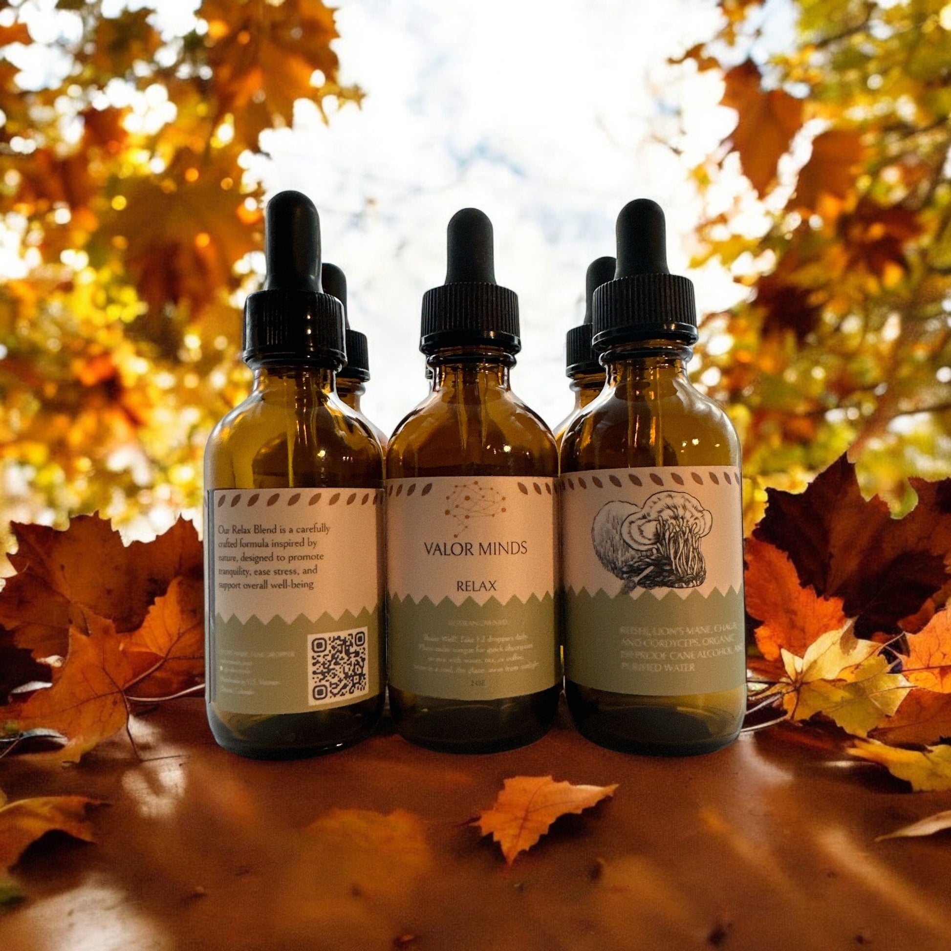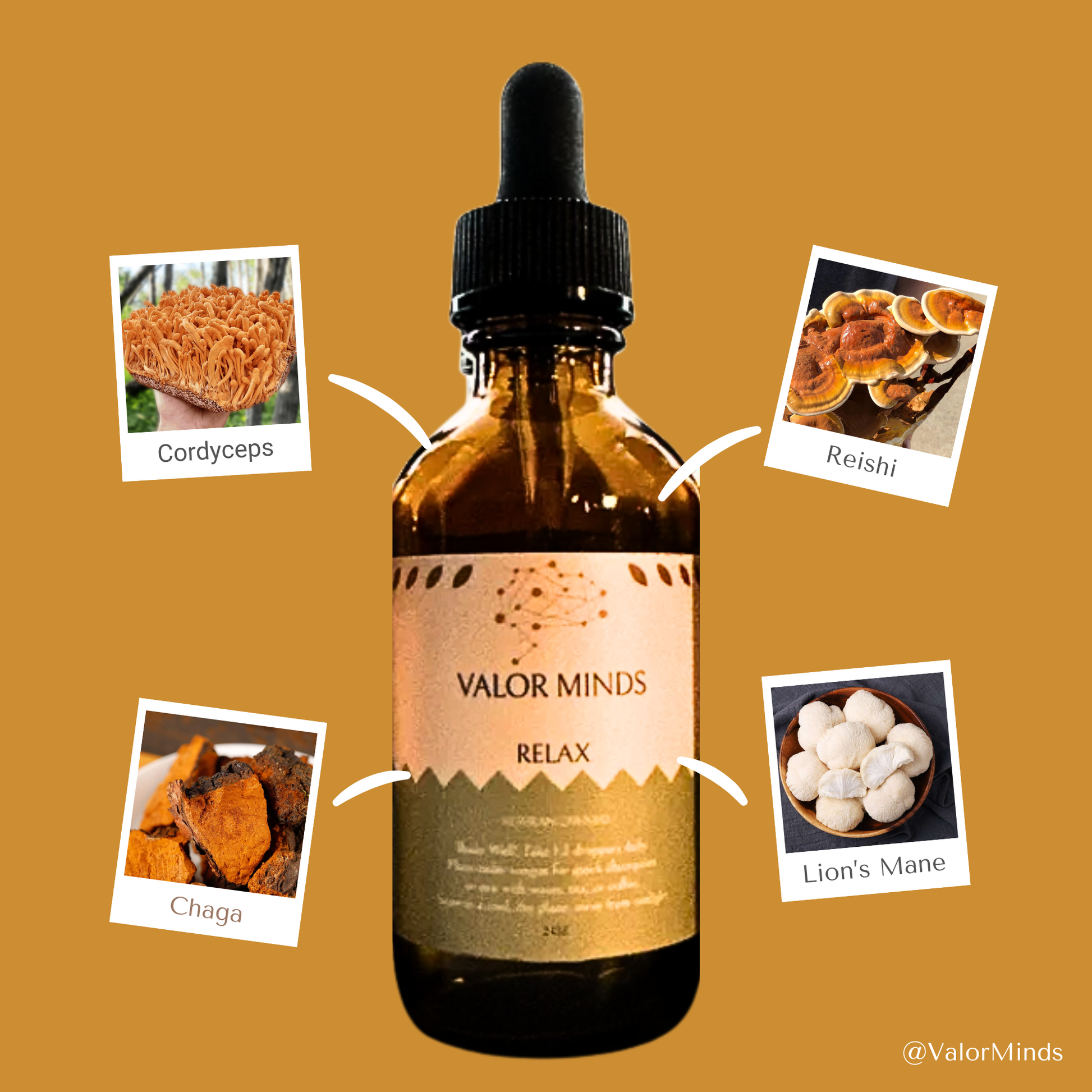 Find your calm with Relax, a carefully crafted blend of Cordyceps, Lion's Mane, Reishi, and Chaga mushrooms. Designed to promote tranquility and help you unwind, Relax supports a balanced mood, reduced stress, and overall mental clarity. Each ingredient is chosen for its unique properties — Cordyceps to enhance energy, Lion's Mane for mental sharpness, Reishi to soothe the mind, and Chaga to bolster resilience. Experience a natural way to find peace amidst the chaos of daily life. Embrace relaxation and nourish your mind with Valor Minds.